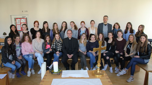 Am 20. April besuchte Weihbischof Karl Borsch unsere Schule. Er traf sich mit einer Klasse 9 und mit Kolleginnen und Kollegen. Trotz der knappen Zeit, denn Weihbischof Borsch hat im Rahmen seiner Visitationen sehr viele Termine, waren es sehr gute Gespräche, vor allem mit den Schülerinnen.