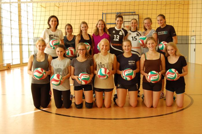 Zwei Profis der Volleyballbundesligisten "Ladies in Black", Karolina Bednarova und Ron Ponte, besuchten am Freitag die Schülerinnen und führten ein Volleyballtraining durch. Zum Abschluss wurde dann auf großem Feld gespielt, wobei sich beide Mannschaften nichts schenkten- immerhin musste die Verlierermannschaft einen Kuchen für die Gewinner backen!