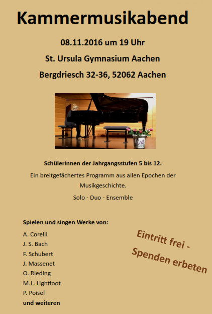 Am Dienstag, 8. November, findet in der Aula unserer Schule unser diesjähriger Kammermusikabend statt, zu dem wir Sie und Euch ganz herzlich einladen.