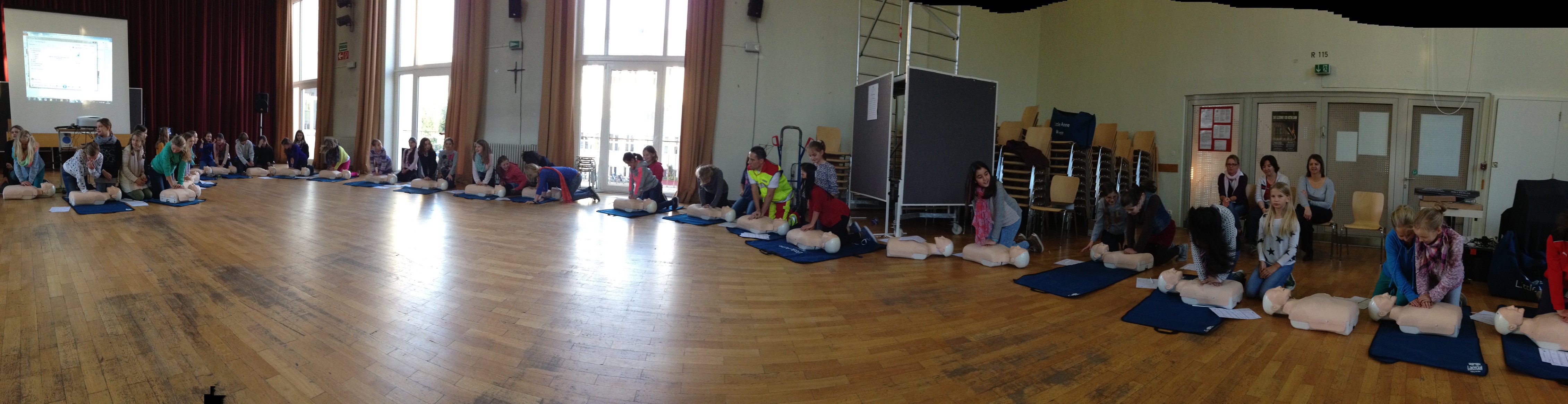 Am 27.10.2014 haben alle unsere Schülerinnen ein Reanimationstraining durchlaufen, das u.a. von Ärzten des Klinikums angeboten und durchgeführt wurde. Der Grundgedanke für dieses "Schnelltraining" ist, die Hemmschwelle für die erste Hilfe bei Herzstillstand herabzusetzen, so dass innerhalb der 8 Minuten, bis der Notarzt kommt, die Überlebenschance des Betroffenen erheblich vergrößert werden kann.