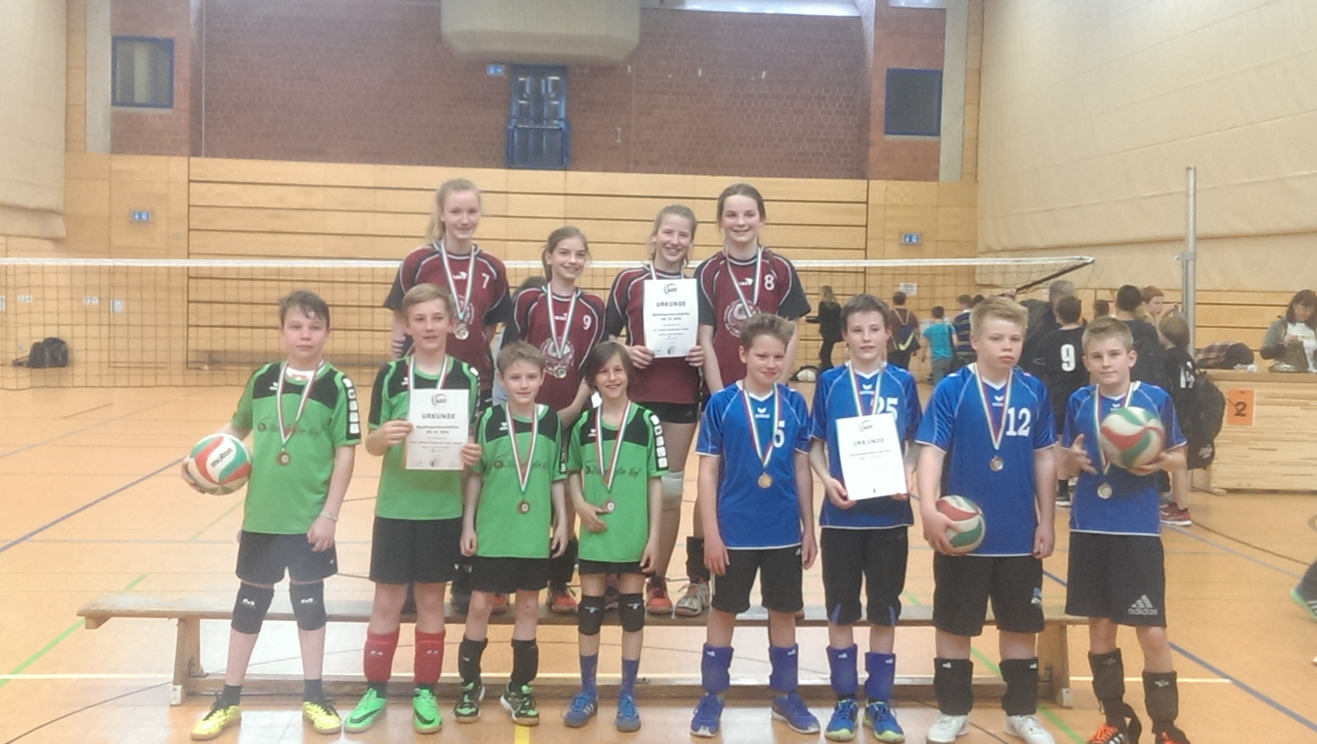 Die Schulmannschaft der Wettkampfklasse IV ( Jahrgänge 2003- 2005) startet richtig durch. Nachdem sich die Spielerinnen bei den Bezirksmeisterschaften des Westdeutschen Volleyball- Verbandes gegen 11 andere Mannschaft durchgesetzt und den 1. Platz belegt haben, sind sie nun auch Stadtmeister geworden. In einem spannenden Spiel haben sie die Mannschaft des Rhein- Maas Gymnasiums mit 2:1 Sätzen besiegt. Eine tolle Teamleistung!!