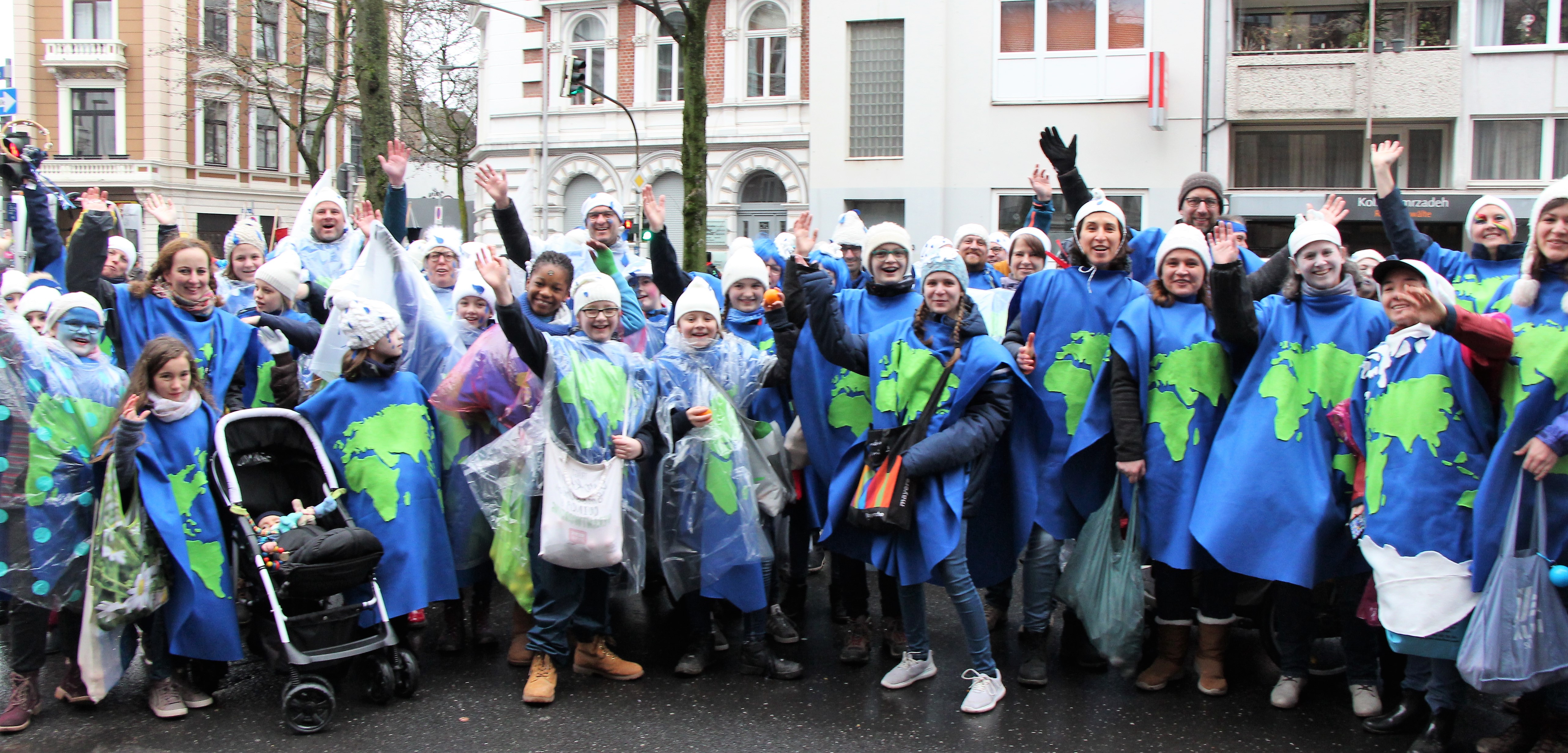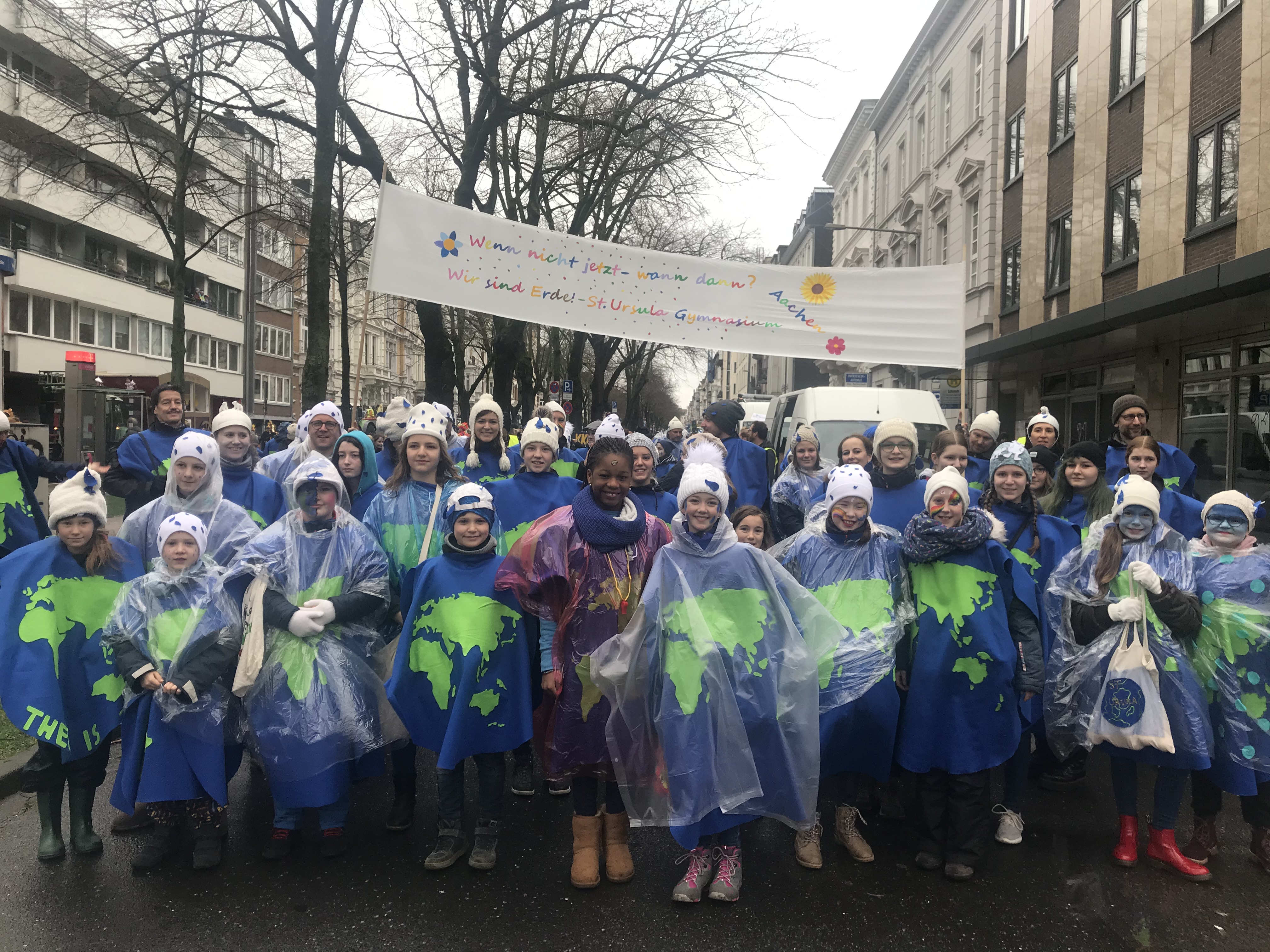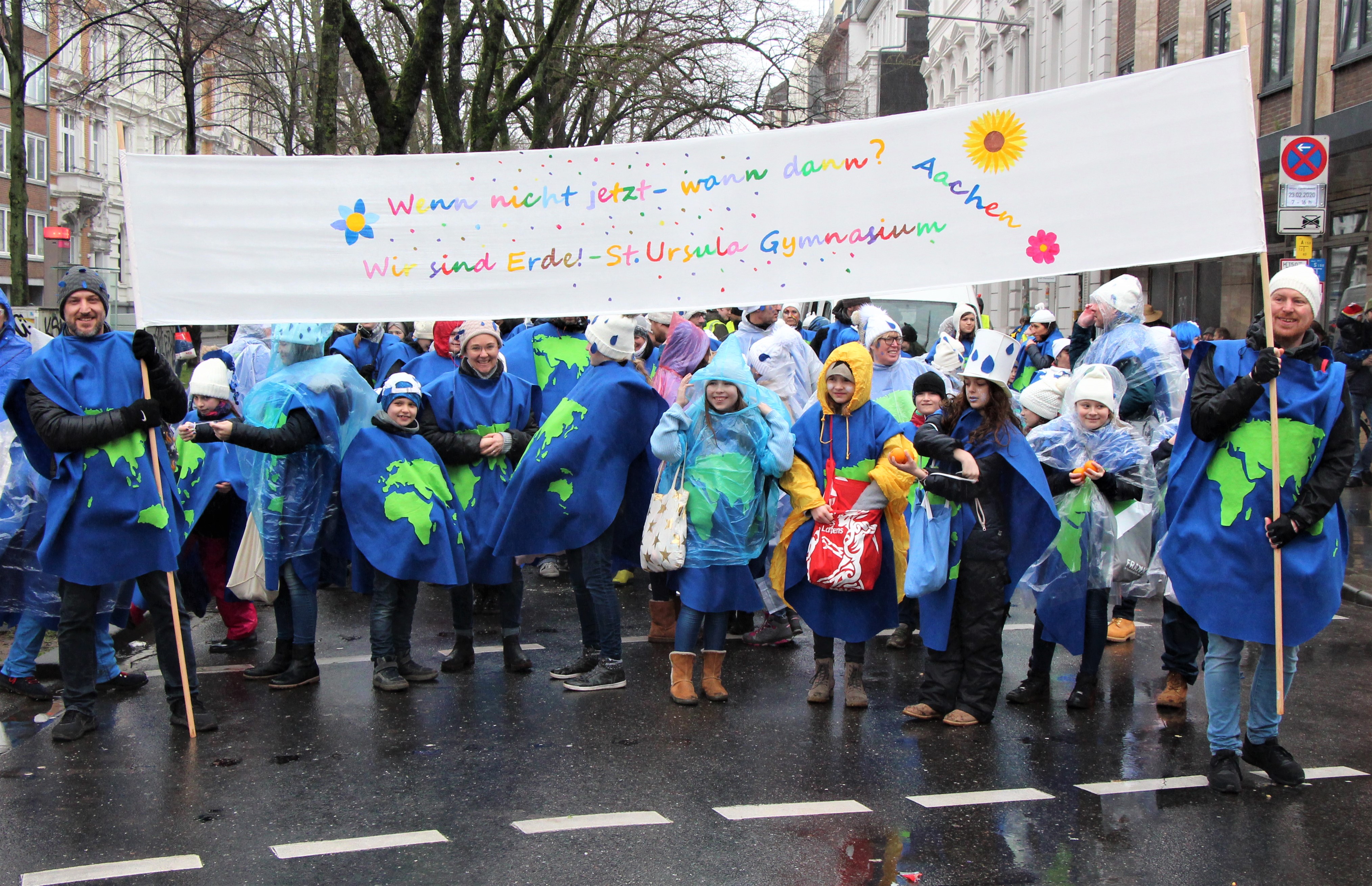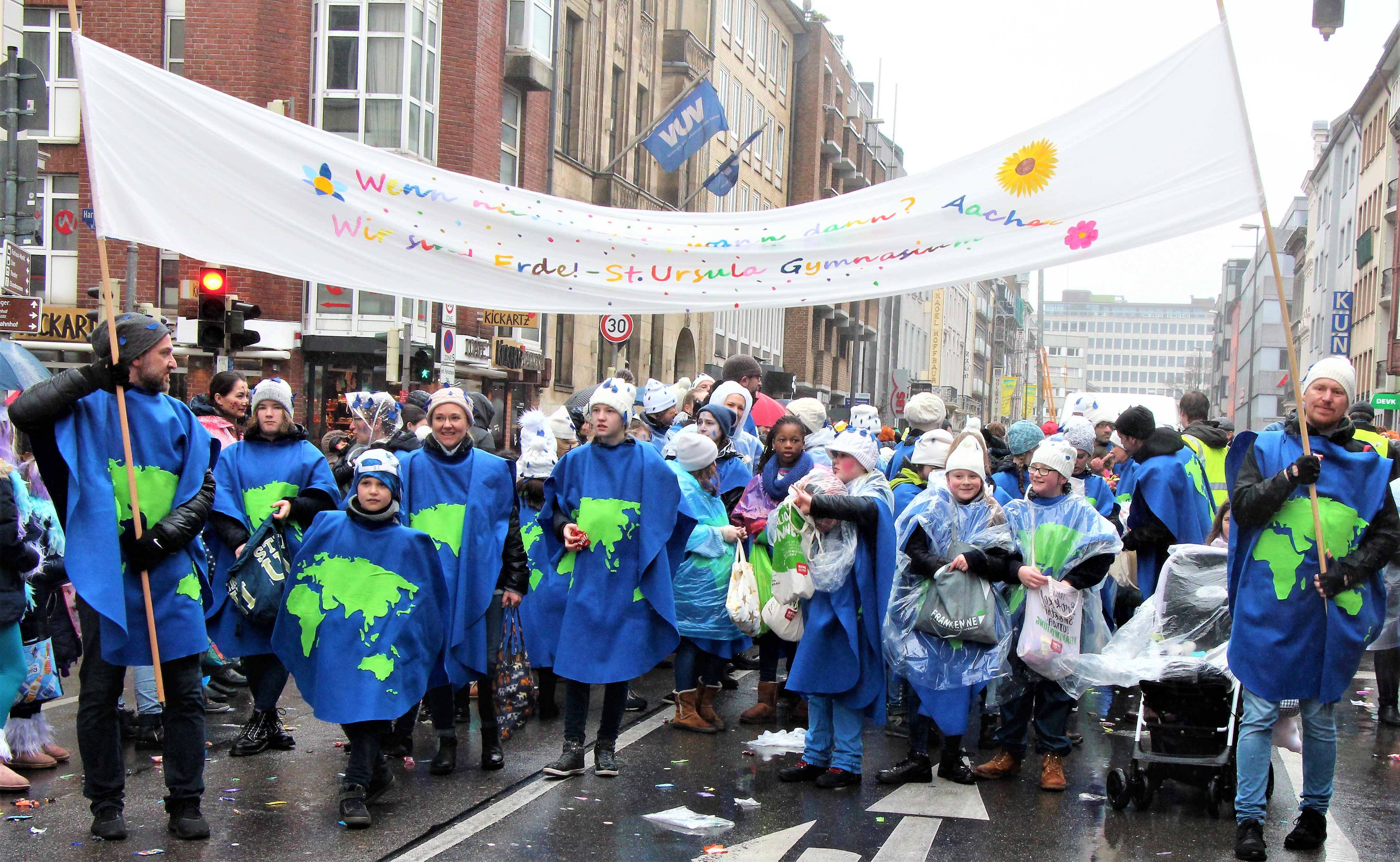 Auch bei Regen und Sturm haben sich ca. 90 jecke Schülerinnen, Lehrer und Eltern beim Kinderzug auf den Weg durch Aachen gemacht. Verkleidet als blau-grüne Erden haben wir tonnenweise Orangen, Süßigkeiten und gute Laune an die vielen Kinder und Erwachsenen am Rand verteilt und hatten selbst auch wieder viel Freude dabei! Danke an alle, die mitgemacht haben und besonders an Frau Vandeneschen-Reimmann für die tolle Organisation. Wir wünschen weiterhin fröhliche Karnevalstage - und sehen uns am Aschermittwoch um 8 Uhr in St. Peter zum Gottesdienst wieder! St. Ursula Alaaf!