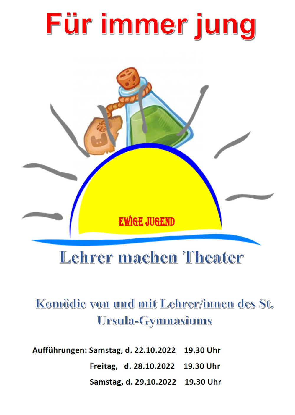 "Für immer jung" sind die Schülerinnen und Schüler, die Tag für Tag durch die Eingangshalle des St. Ursula Gymnasiums kommen. "Für immer jung" durfte sich vor kurzem auch eine Gruppe unseres Kollegiums gefühlt haben, die Freunde, Eltern, KollegInnen und nicht zuletzt unsere Schülerschaft mit dem gleichnamigen Stück eines Lehrertheaters unterhalten und zum Lachen bringen konnte.