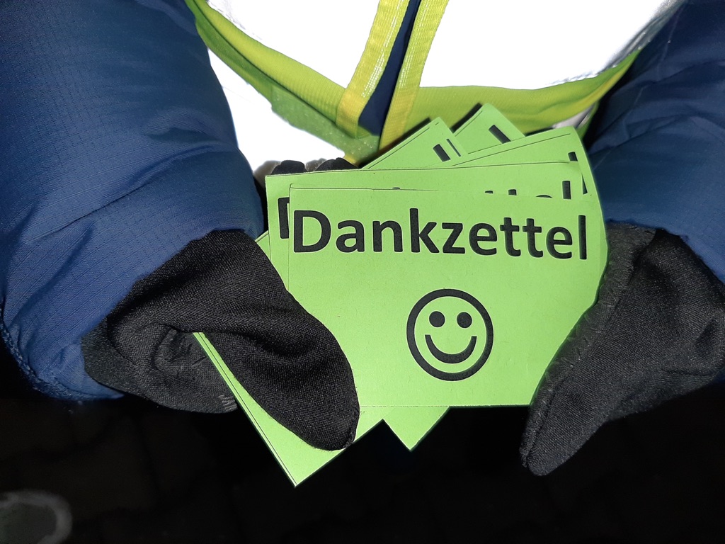 Die Kinder verteilten an die Autofahrer, die ihre Kinder an sinnvollen Haltepunkten aussteigen ließen, Dankzettel. Die Eltern, die in zweiter Reihe oder im absoluten Halteverbot anhielten, wurden von den Kindern höflich darauf hingewiesen, dass dieser Haltepunkt nicht sinnvoll sei, und vergaben diesen einen Denkzettel. So wurden leider viele Denkzettel, aber auch einige Dankzettel verteilt.